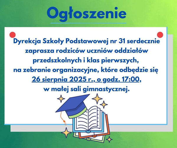 Serdecznie zapraszamy rodziców uczniów przyszłych oddziałów przedszkolnych i klas pierwszych na zebranie organizacyjne, które odbędzie się 26 sierpnia br., o godz. 17:00, w małej sali gimnastycznej.