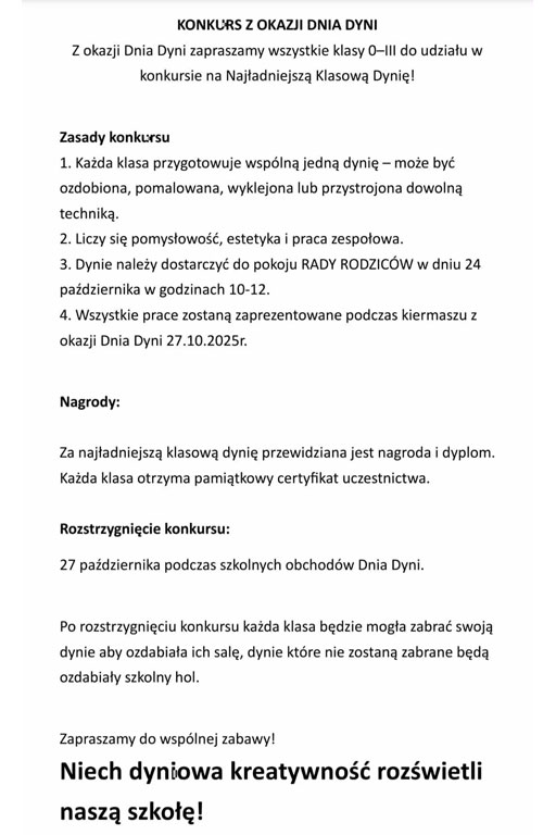 Rada Rodziców serdecznie zaprasza całą społeczność szkolną do udziału w kiermaszu z okazji Święta Dyni.